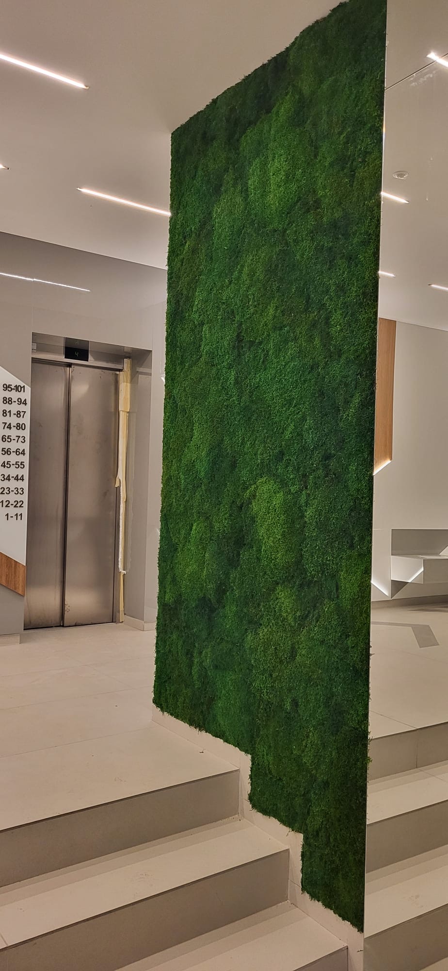 Holurile de blocuri sunt de obicei spații reci, fără ferestre și cu lumină artificială. Aici, mușchiul plat strălucește: nu are nevoie de soare, nu produce alergeni, nu adăpostește insecte și oferă un efect estetic verde intens, chiar și în cele mai întunecate colțuri.